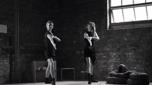 Pillow Dance Iteration (133 Design Collective, June 2016) Image description: Angelina Marriott and Kiera stand in a room with brick walls and a large window and intestinal pillow sculpture by Maddy Geftic to their left. They both step forward with their right legs and touch their own right forearms with their left hands. Photo credit: Dana Trunk